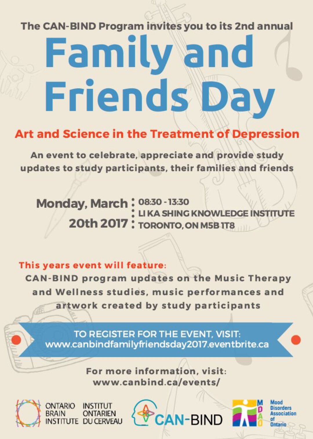The Canadian Biomarker Integration Network in Depression (CAN-BIND) second annual Family and Friends Day will provide research and program updates to CAN-BIND study participants, their friends, and families who have living experience of clinical depression. This event will also include art, music and other social activities. For more information visit: http://www.canbind.ca/.