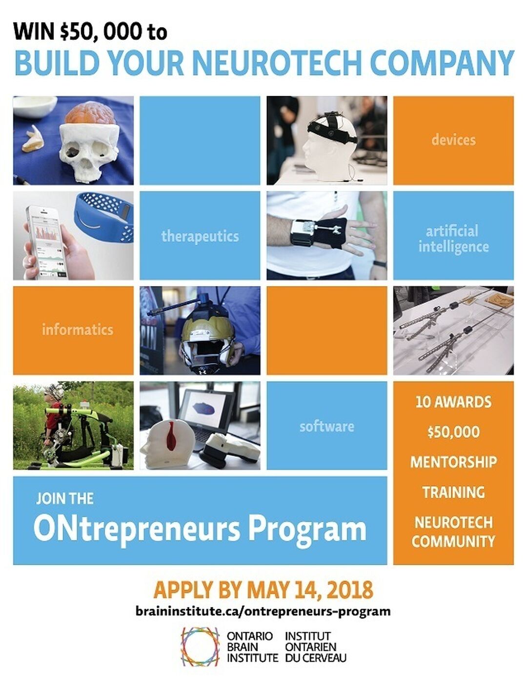 The ONtrepreneurs (Ontario Neurotech Entrepreneurs) Program is an opportunity for Ontario’s next generation of entrepreneurs to access much-needed funding and support for the launch or growth of their neurotechnology startup company. The 12-month program awards $50,000 cash and includes mentorship, training, and a number of value-add opportunities to fuel the entrepreneurial spirit in commercializing neurotechnologies. For more information see here.