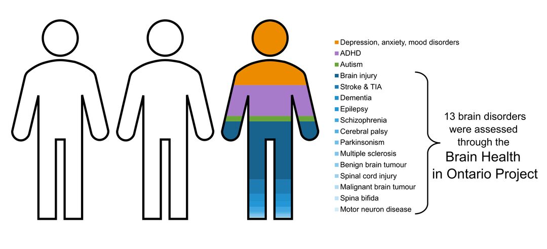 Combining health system data (2019) with other prevalence estimates found that brain disorders directly impact 1/3 of the Ontario population. These brain disorders range from highly prevalent disorders that impact >10% of the population like depression and brain injury (traumatic brain injury and concussion), those that impact 1 - 10% of the population including ADHD, stroke, and dementia, to disorders like cerebral palsy or parkinsonism which directly impact <1% of the population.