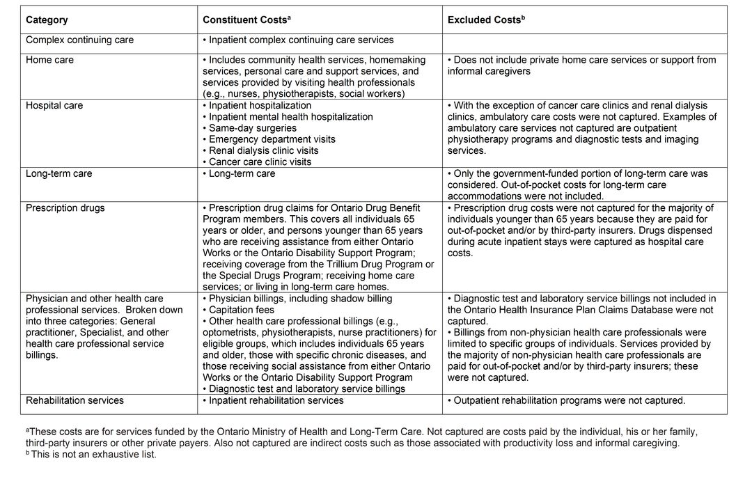 | Long-term care | • Long-term care | • Only the government-funded portion of long-term care was considered. Out-of-pocket costs for long-term care accommodations were not included. |