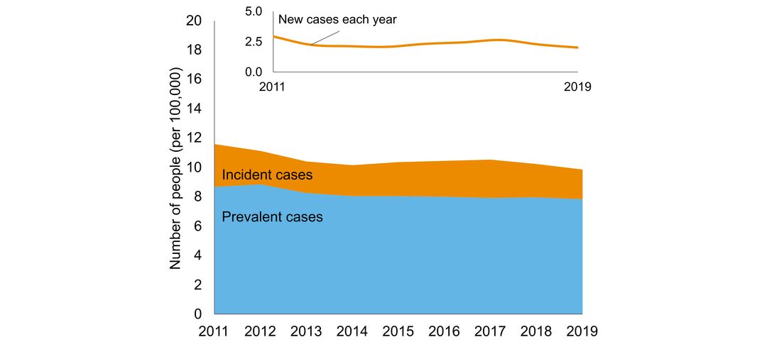 Amyotrophic lateral sclerosis typically presents in those between 40 and 70 years of age. Amyotrophic lateral sclerosis causes progressive weakness of the muscles in the mouth, throat, arms and legs. Affected persons may also develop cognitive difficulties or dementia. Amyotrophic lateral sclerosis is associated with premature mortality, with death often occurring within three to five years of symptom onset. While 5% of amyotrophic lateral sclerosis cases are hereditary, the definitive cause of the disease remains unknown for the other 95% cases. Amyotrophic lateral sclerosis has no cure, and effective treatment for motor neuron disease remains elusive. Currently, only one drug has been approved for the treatment of amyotrophic lateral sclerosis, and it has only modest effectiveness – it can only slow the progression of the disease and extend the lifespan by a few months.